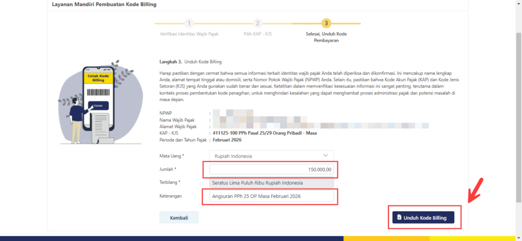- Klik UNDUH KODE BILLING untuk mendapatkan file pdf nya