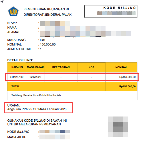 Kode ini khusus untuk PPh Pasal 25 Angsuran. Pastikan tidak tertukar dengan kode setoran PPh lainnya seperti PPh Final atau PPh 21.