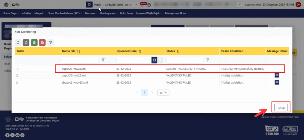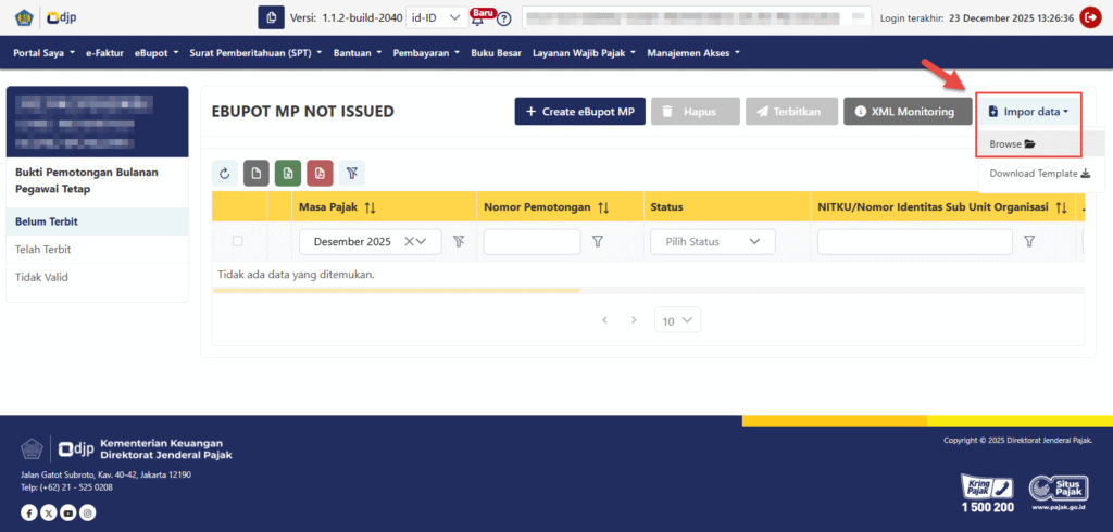Ulangi pengecekan dan jika sudah benar datanya silahkan ulangi export data dan lakukan impor ulang pada coretax menu EbupotBukti Pemotongan Bulanan Pegawai TetapImpor DataPilih Browse . Jika sudah berhasil upload cek validasi nya dan pastikan muncul keterangan sukses seperti gambar dibawah ini