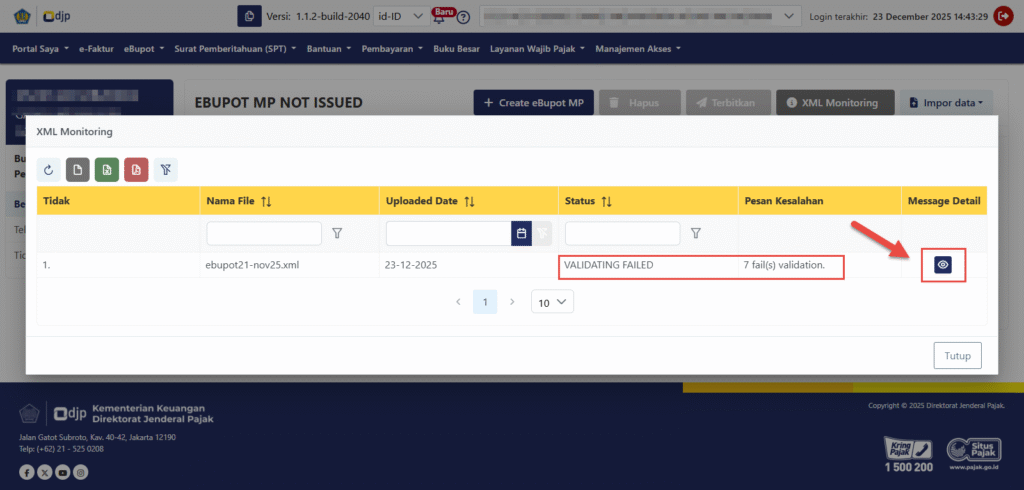 Berikutnya silahkan cek hasil validasinya. Jika muncul keterangan eror semisal Validating Failed berarti proses impor gagal karena data tidak sesuai. Kita bisa cek detil error nya dengan klik icon mata (tanda panah) sesuai gambar dibawah ini
