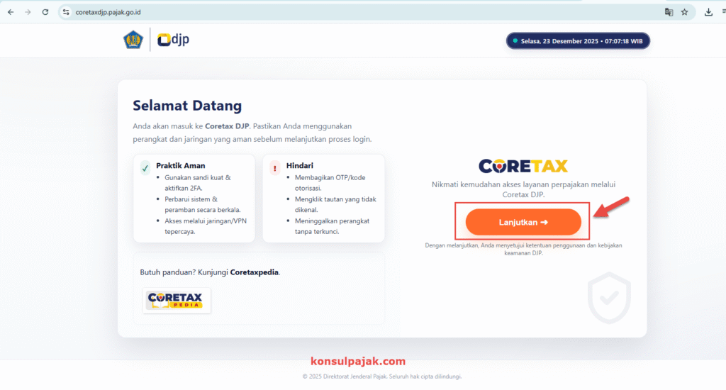 Untuk melakukan impor data bukti potong PPh 21 pegawai tetap bulanan di coretax silahkan buka coretax melalui tautan https://coretaxdjp.pajak.go.id dan klik Lanjutkan