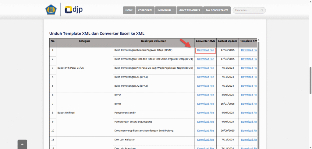 Step pertama adalah silahkan unduh terlebih dahulu file format impor yang bisa diunduh di pajak.go.id sesuai contoh gambar dibawah