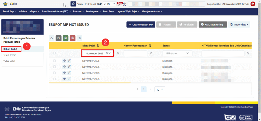 Jika sudah muncul keterangan sukses, maka silahkan pilih menu Belum Terbit (angka 1) yang ada di sebelah kiri dan lakukan filter masa pajak (angka 2) sesuai dengan masa pajak dimana bukti potong tersebut kita terbitkan.