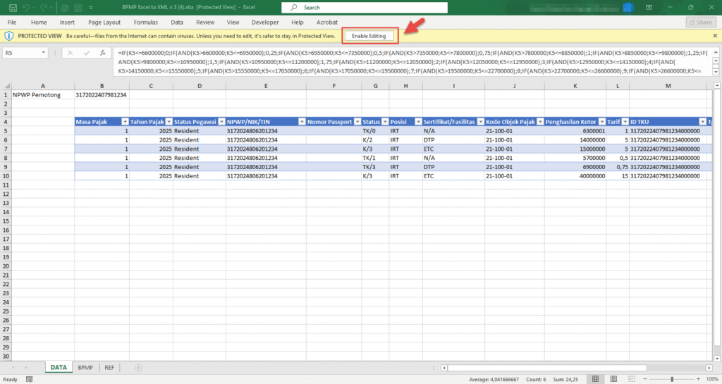 • untuk bagian TER A, TER B, TER C jangan dirubah rumus yang ada pada kolom tersebut agar tidak merusak struktur file xml yang nanti akan di export. jika jumlah baris melebihi file contoh maka silahkan copy rumusnya dengan pilih copy paste Formula