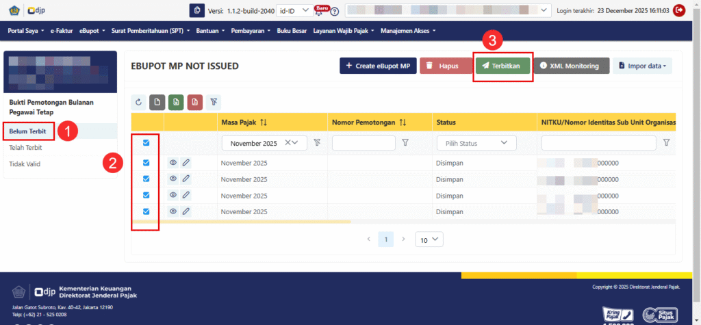Untuk menerbitkan bukti potong tersebut kita pilih bukti potongnya (angka 2) dan kita pilih menu Terbitkan (angka 3)