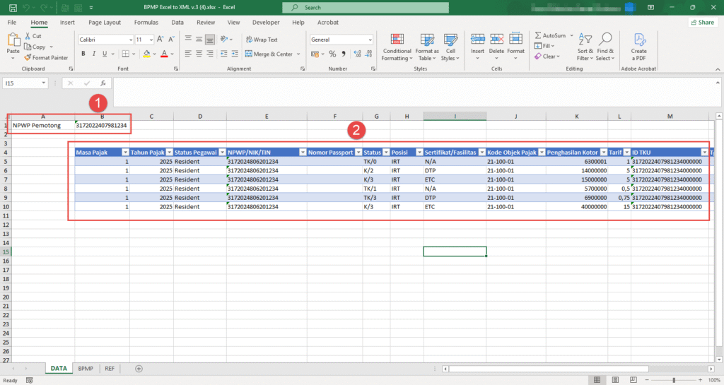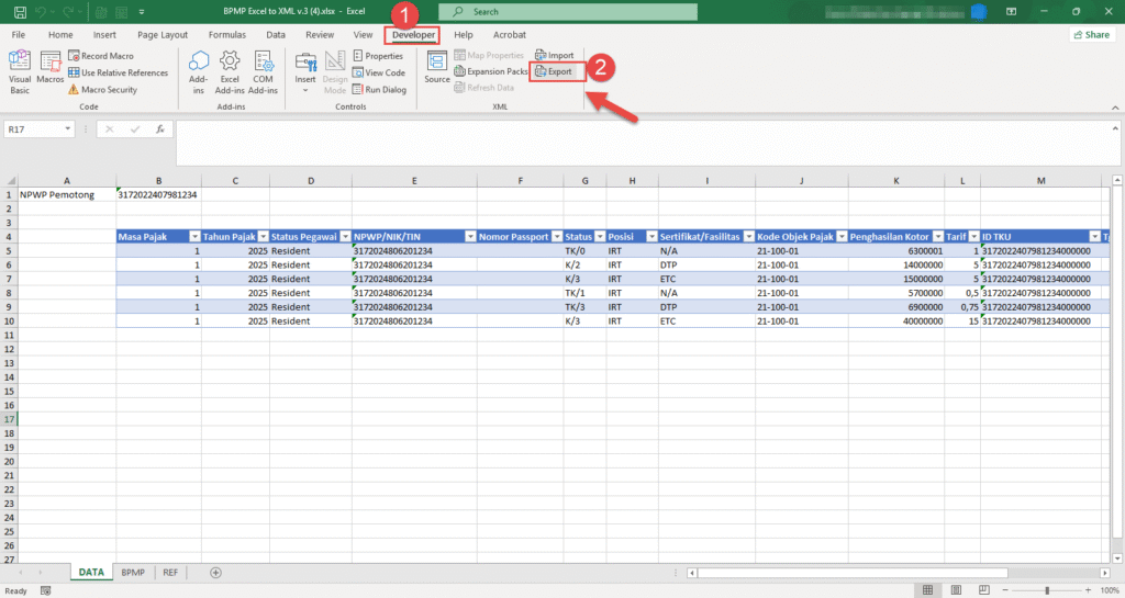 Jika data sudah selesai diinput semua dan sudah dipastikan datanya benar maka step berikutnya dalah melakukan export ke file XML dengan cara pilih menu Developer (angka 1)– klik menu Export (angka 2)