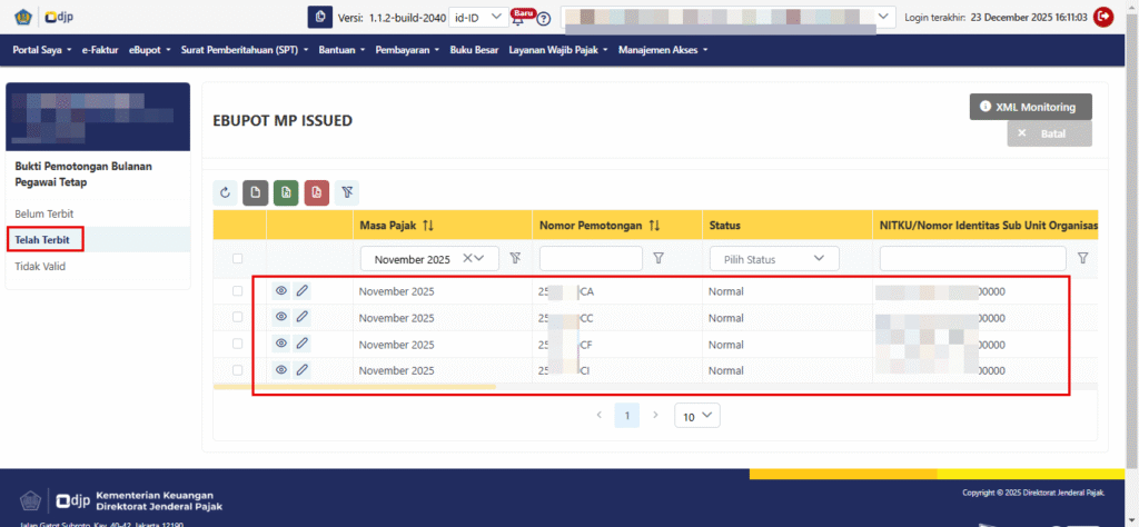 Maka akan muncul notifikasi bahwa document successfully issued dan kita bisa cek bukti potong yang sudah berhasil kita terbitkan akan masuk pada menu Telah Terbit