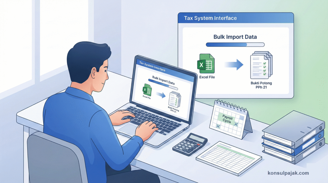 Coretax sebenarnya sudah menyiapkan solusi yang jauh lebih efisien, yaitu pembuatan bukti potong PPh 21 melalui impor data. Dengan metode ini, data gaji, potongan, dan PPh 21 pegawai bisa disiapkan lebih dulu dalam satu file, lalu diunggah sekaligus ke sistem. Hasilnya, puluhan bukti potong bisa terbentuk dalam waktu singkat, tanpa harus mengulang proses yang sama berkali-kali.