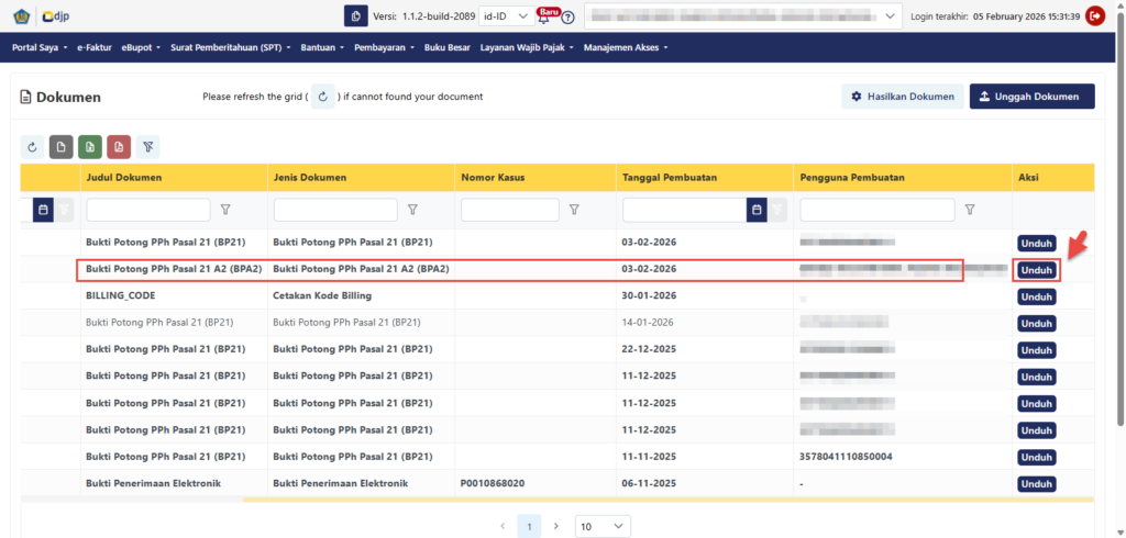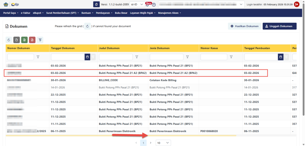 Gunakan filter tahun pajak atau jenis dokumen, scroll ke kanan lalu pilih Bukti Potong 1721-A1 atau 1721-A2 .Klik Unduh. Biasanya file tersedia dalam format PDF. Simpan di folder khusus—misalnya “SPT Tahunan”—agar mudah ditemukan saat mengisi laporan