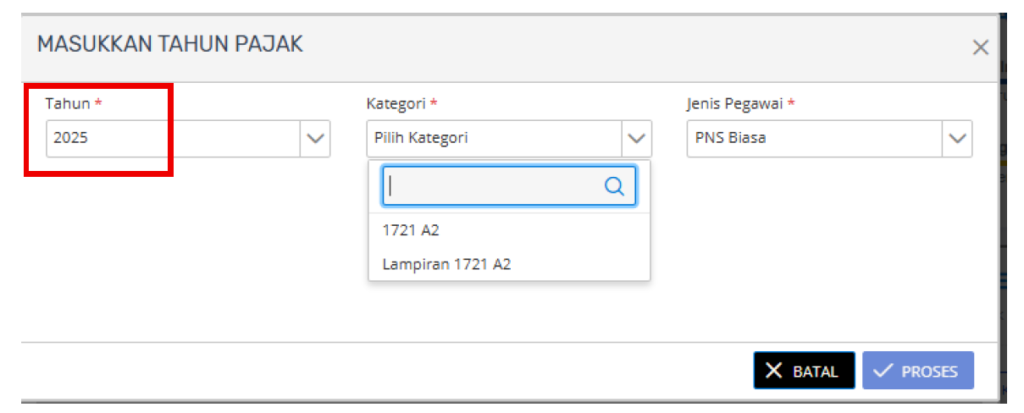 - Pastikan Tahun Pajak dan Jenis Pegawai dipilih benar.