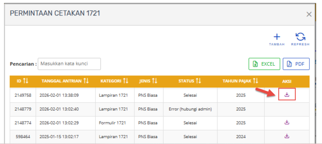 - Jika status berubah menjadi Selesai, tombol Unduh akan muncul pada kolom Aksi.