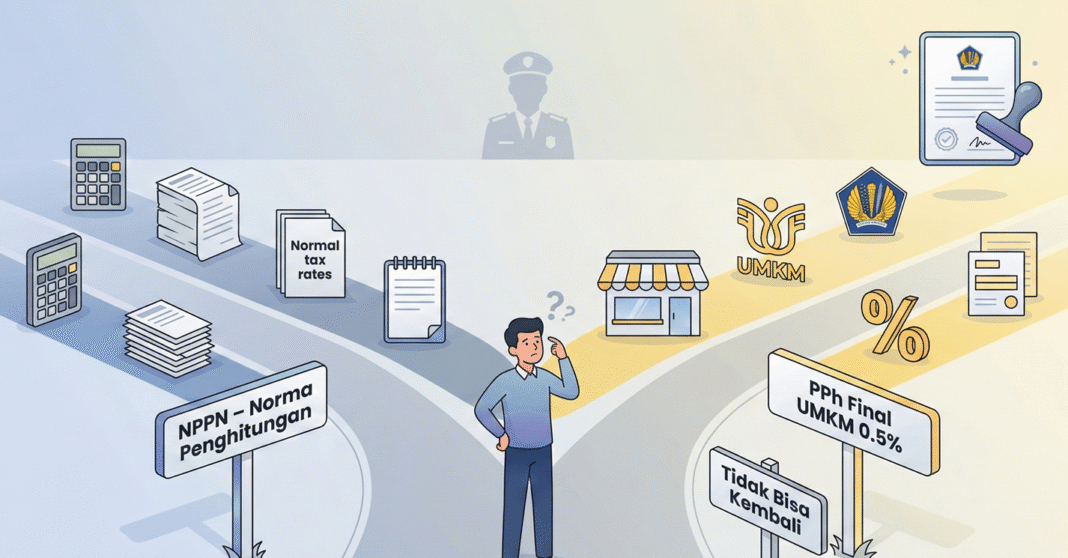 Memilih skema pajak itu seperti memilih jalur—sekali Anda memilih NPPN, maka jalur “final UMKM 0,5%” tertutup untuk periode tersebut.